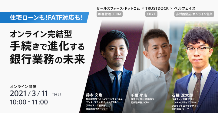 今回は「住宅ローンも!FATF対応も!オンライン完結型手続きで進化する銀行業務の未来」と題して、Salesforce、TRUSTDOCK、ベルフェイスの3社によるオンラインで完結できるソリューションのご提案と今後の銀行業務の未来像について語っていただきます。
