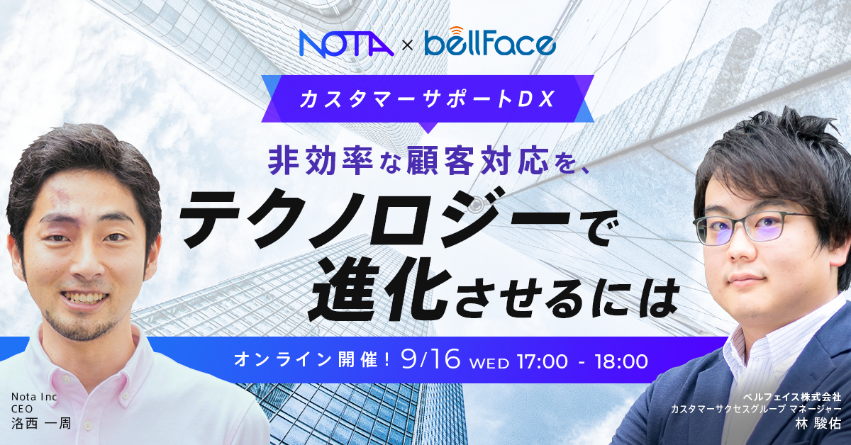この変化していく時代に合わせて、顧客満足度を向上させていくのはサービス、製品を提供する企業としては不可欠です。では、どのように変わっていけばよいのか、どのような施策があるのか。カスタマーサポート、カスタマーサクセスという視点でNota×ベルフェイスの2社よりお話させていただきます。