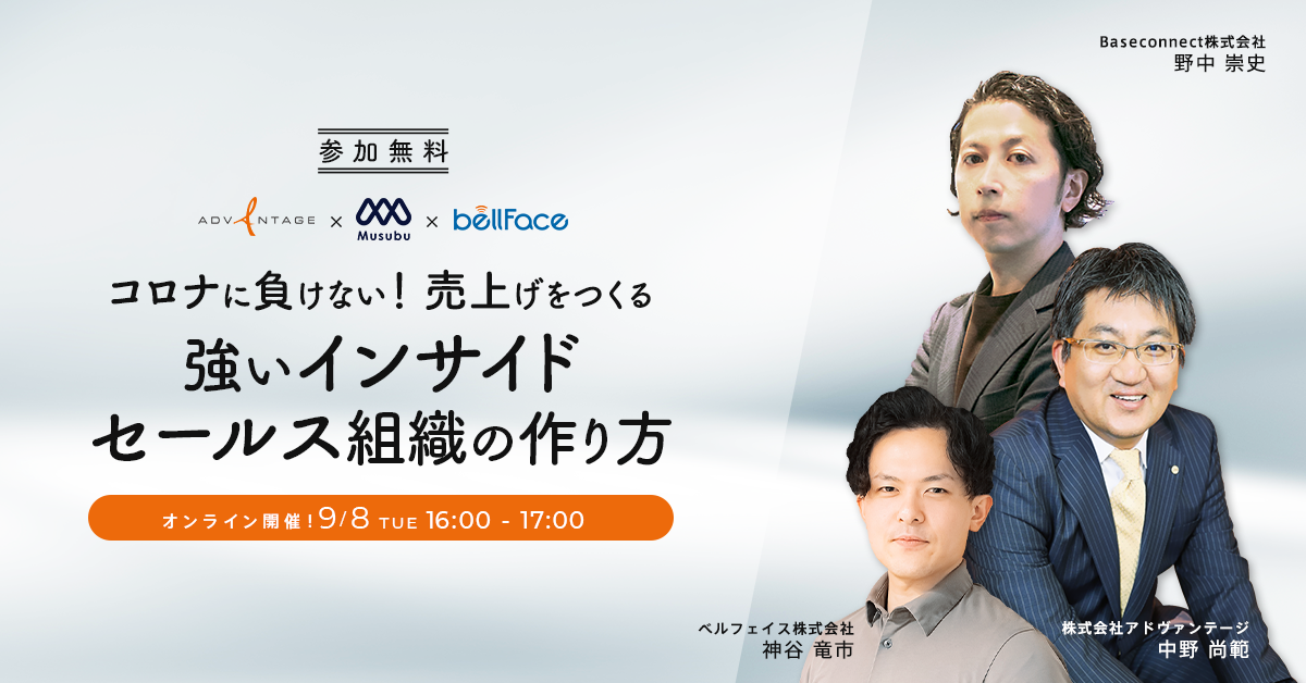 本ウェビナーでは、オンライン会議システム「bellFace」を提供するベルフェイス社、営業支援システム「Musubu」を提供するベースコネクト社、人材採用マーケティングシステム「ちょくルート」を展開するアドヴァンテージ社の3社より、インサイドセールスを始めるにあたって必要な”組織・営業体” ”人材採用” ”育成方法”など幅広い内容を具体的な事例や、BtoB営業で成果を上げている具体的ノウハウを交えてご紹介します。