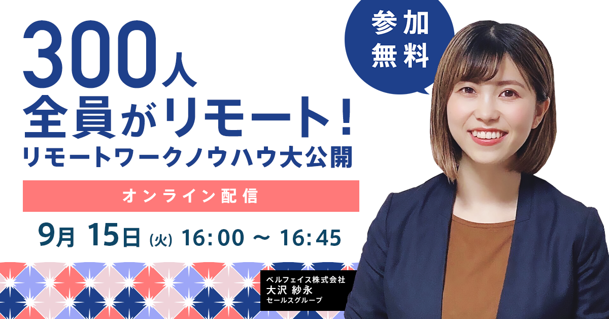本セミナーでは、従業員300人全員がリモートワークを実践しているベルフェイスならではの【リモート施策や心構え】を紹介し、リモート化を推進したい皆さまの課題や悩みを解決します。