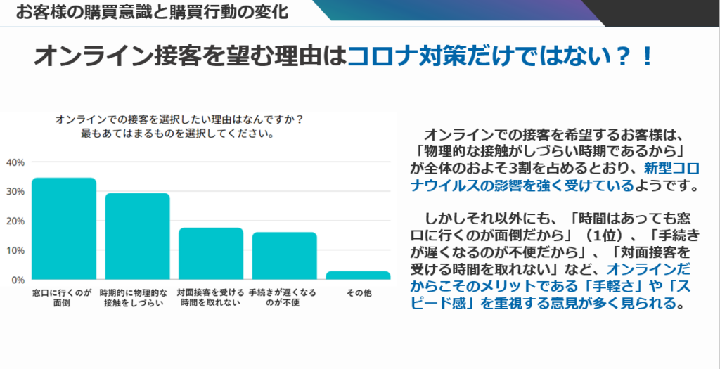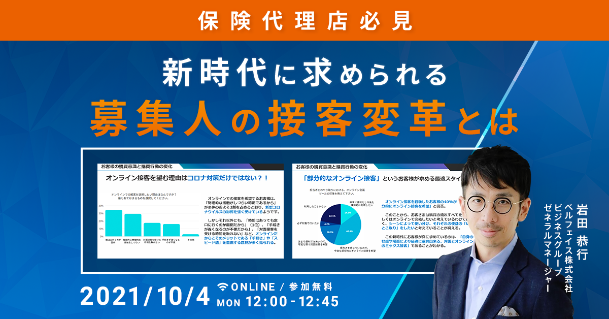 本セミナーでは、ベルフェイスが「直近1年以内に金融・保険商品を購入した経験のある方」を対象に行ったオンライン接客と対面接客の希望意向の調査データをもとに、下記ポイントを解説します。