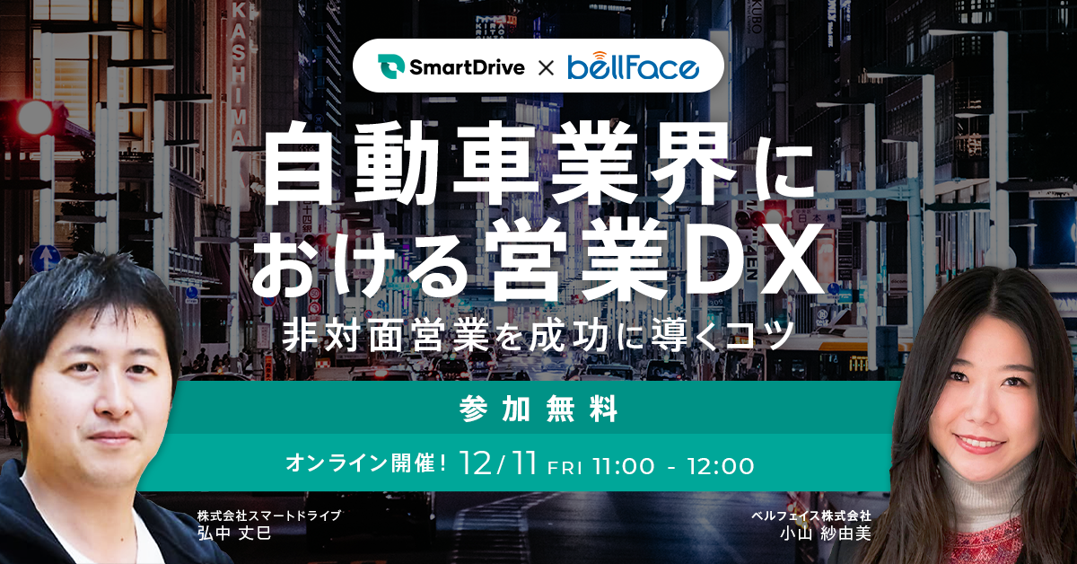 オンライン商談が手軽に実施できるツールを提供しているベルフェイスと、移動体からのデータ収集や解析、利活用までを一気通貫で支援を行うスマートドライブが共催で営業活動のデジタル変革を実現したい企業様に向けて、ニューノーマル時代の対面及び非対面営業活動についてお話します。