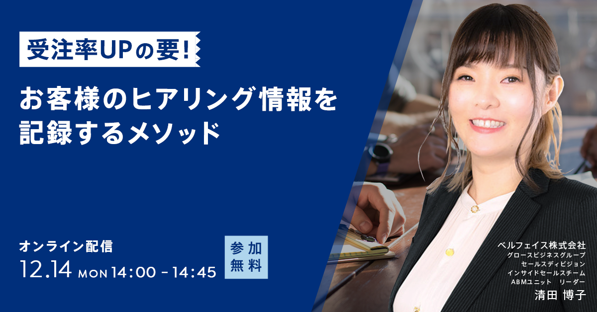 ここの技術が確立していないと、どれだけ優れたヒアリングを行っても受注には繋がりません。このセミナーでは、そんな受注の要になる「ヒアリング内容の記載のコツ」を、ベルフェイスが誇るインサイドセールスのプロがお話します。