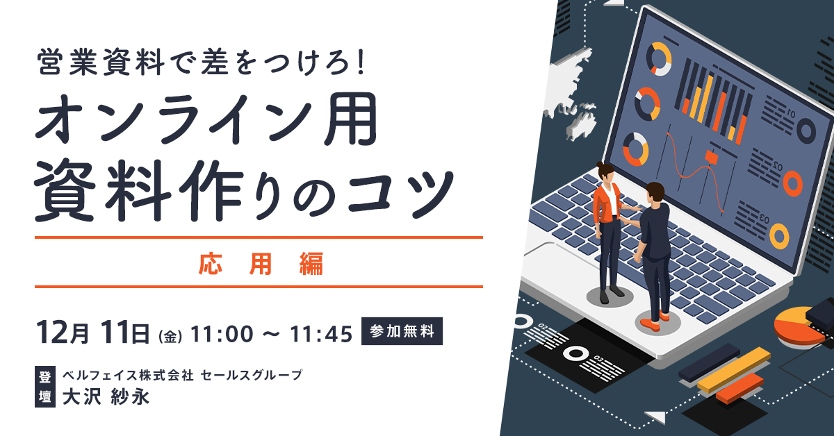 オンラインに商談において欠かせない事前準備のひとつとして、オンライン用の営業資料作りがあります。初級編では文字の大きさやフォントの種類、色のバランスなど営業資料作成の基本やベルフェイスが実践している資料作りのコツについてご説明をしておりますが、実践編ではさらに踏み込んで、資料を作成する目的と重要性を整理しながら、実際にどのような構成・ステップで資料を作成するのか、すぐに実践できるTipsを交えながらご紹介いたします。