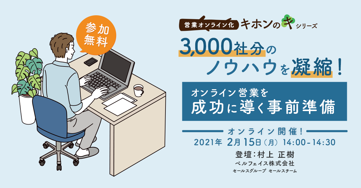 このセミナーでは、これまで3,000社以上の企業に営業のオンライン化を支援してきたベルフェイスが蓄積した事前準備ノウハウを30分に凝縮してお伝えします!