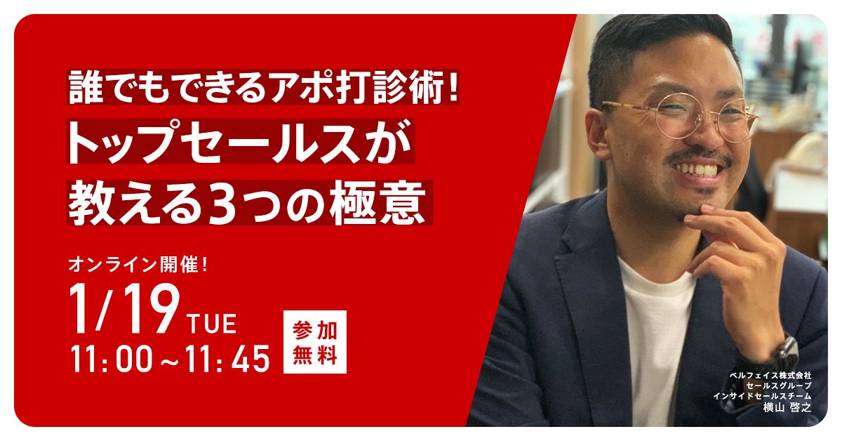 毎回満員御礼、大好評につき!第3回目を開催させていただきます。本セミナーではベルフェイスのトップセールス 横山が、アポイントを量産するために大事にすべき極意をお伝えします。