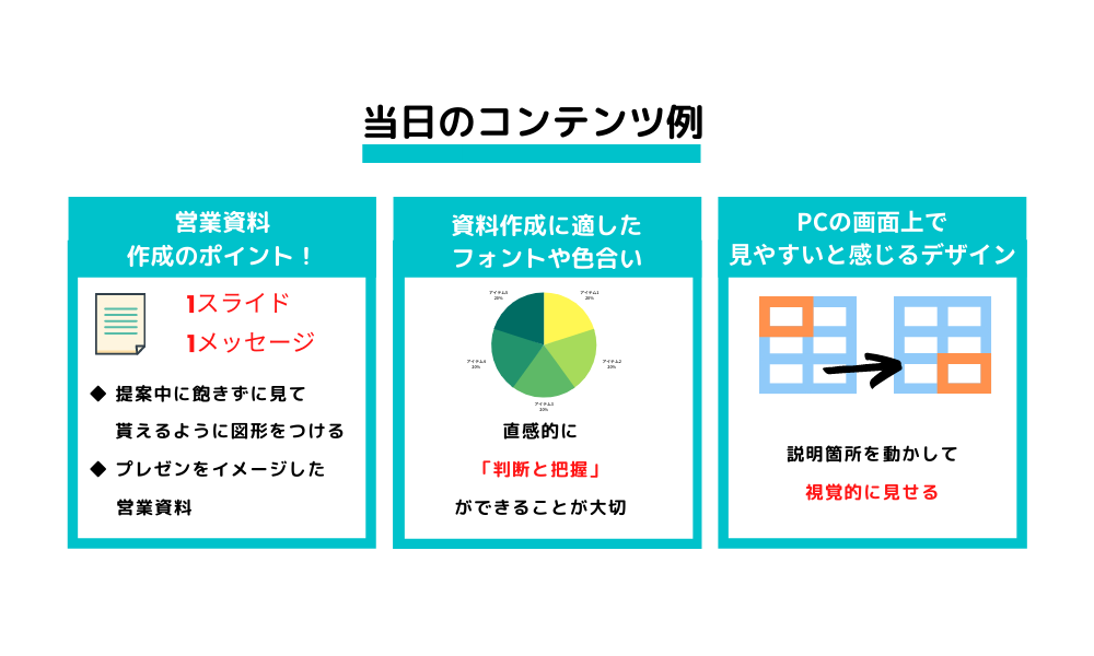 ✔ 文字の大きさやフォントの種類、色のバランスなど営業資料作成の基本