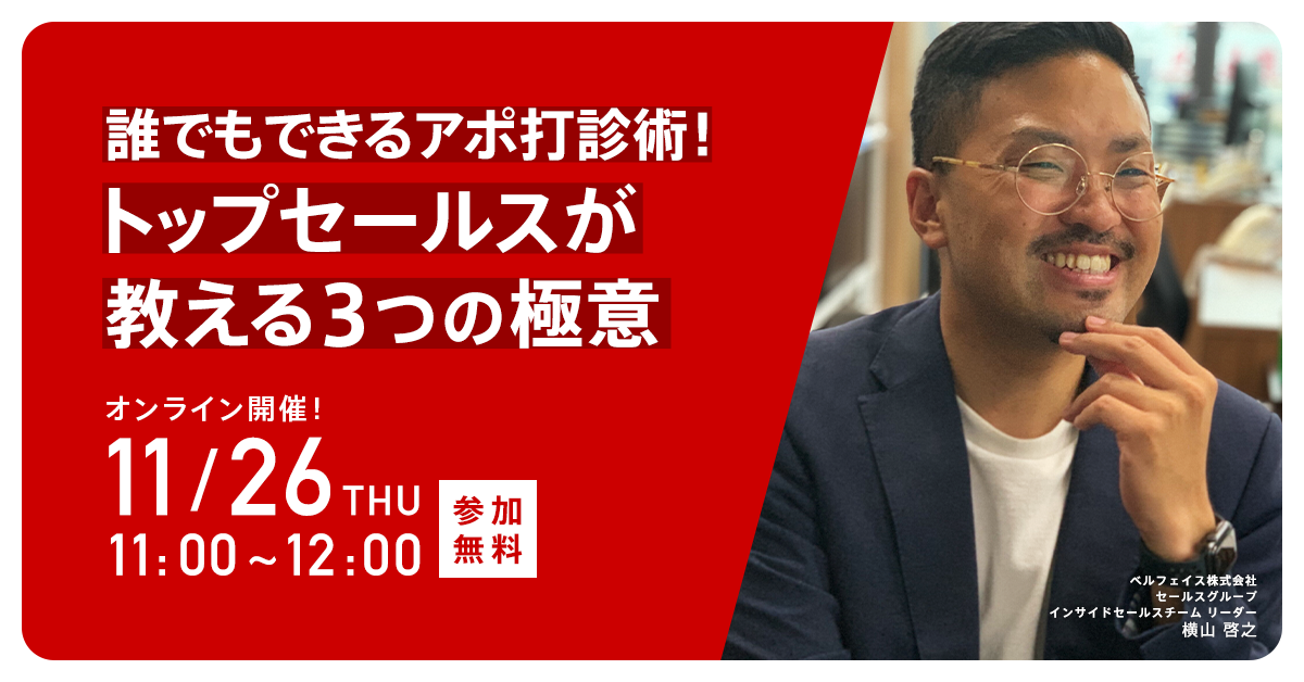 大好評につき、第二回を開催させていただきます。本セミナーではベルフェイスのトップセールス 横山が、アポイントを量産するために大事にすべき極意をお伝えします。